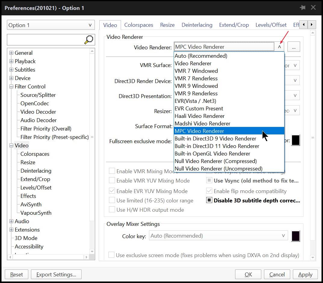 - Select MPC Video renderer from the drop down list labelled Video Renderer.
