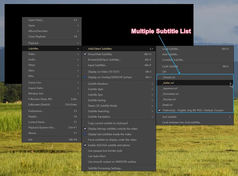 - Select Subtitles > Add/Select Subtitles > (select a subtitle which will be shown)